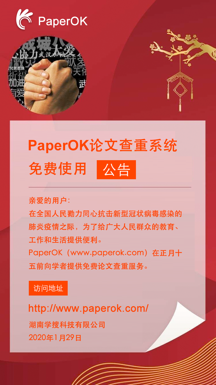在全國人民勠力同心抗擊新型冠狀病毒感染的肺炎疫情之際,為了給廣大人民群眾的教育、工作和生活提供便利,PaperOK網(wǎng)(www.hlqye.cn)在正月十五前(含正月十五)向?qū)W者提供免費論文查重服務(wù)。
